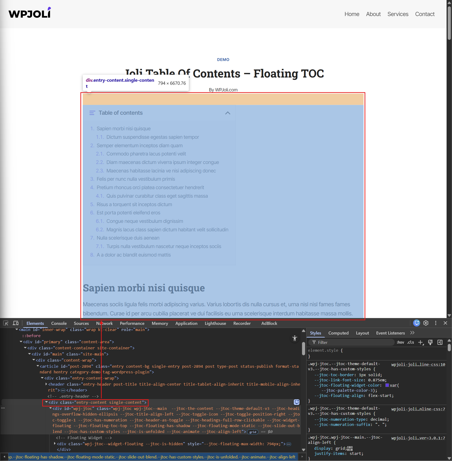 To determine what your content container selector, browse to a page where the floating TOC is activated and around the top of the article (ideally on the inline table of contents), right click and press “Inspect” to bring up the element inspector.