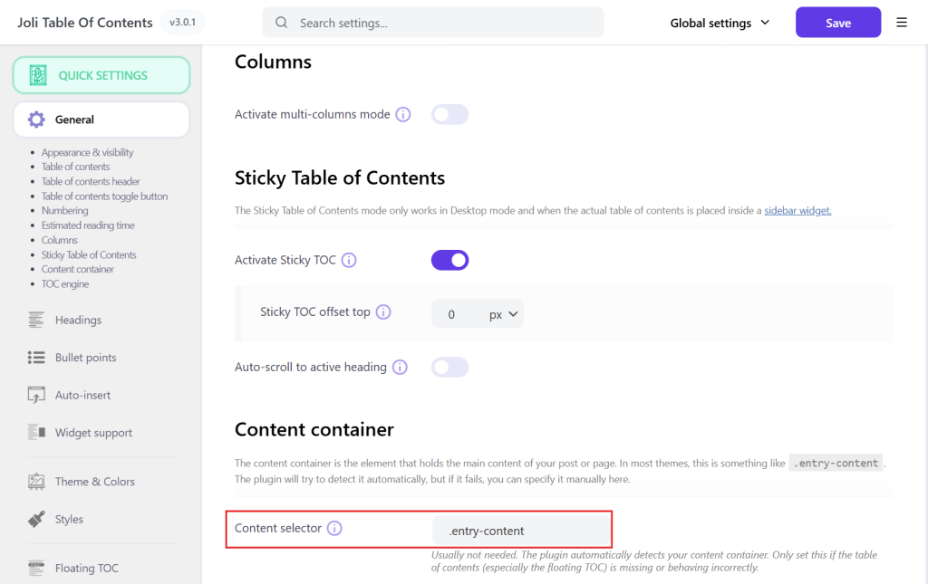 After you’ve determined the content container selector, enter it in Content selector (under General > Content container) and save the settings.