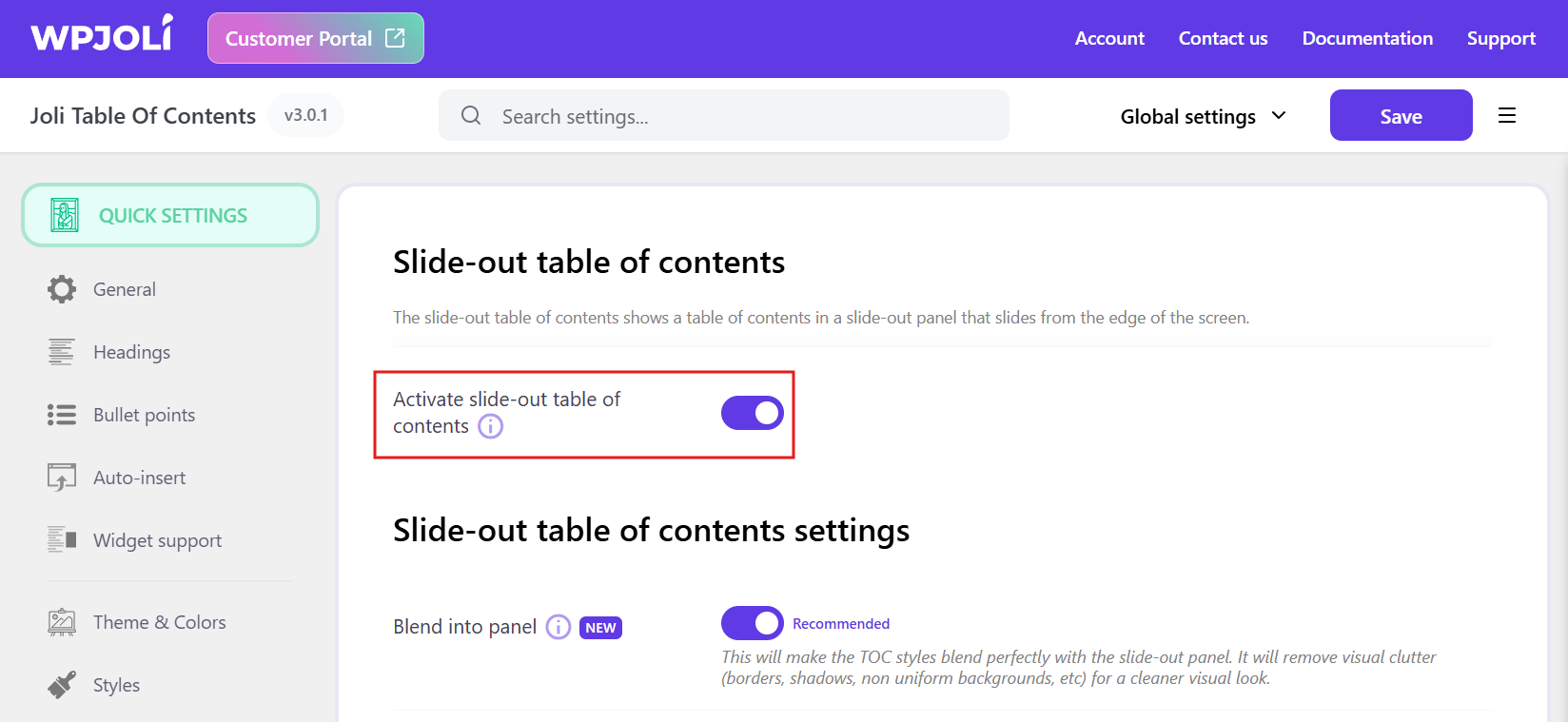 For a cleaner look of the table of contents within the Slide-out, switch on the Blend into panel option